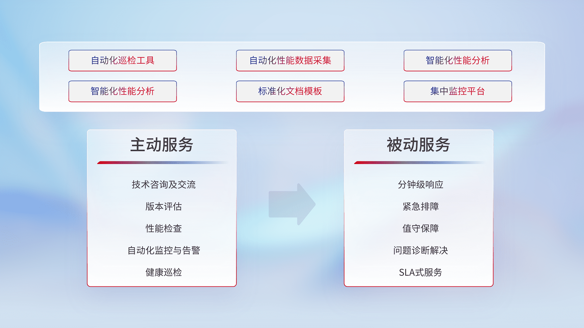 智能化工具和标准化文档,,,,保障服务质量,,,,提供主动服务(包含技术咨询、、、版本评估、、、性能检查、、、、自动化监控与告警、、、、健康巡检)和被动服务包含(分钟级响应、、、、紧急排障、、、、值守保障、、问题诊断解决、、、、SLA服务)。。