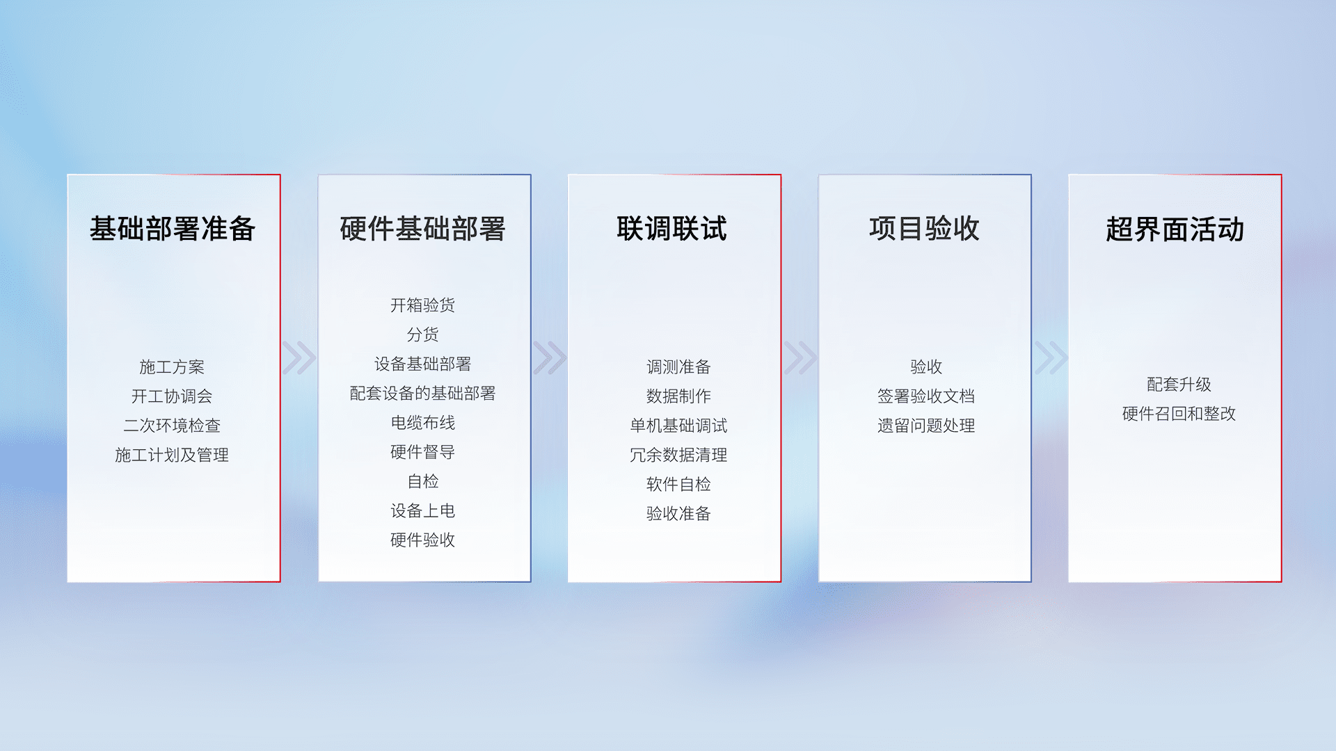 从基础部署准备、、、硬件基础部署、、、联调联试、、项目验收、、、、越界面活动的全过程可追溯,,,,保证施工质量和进度。。。